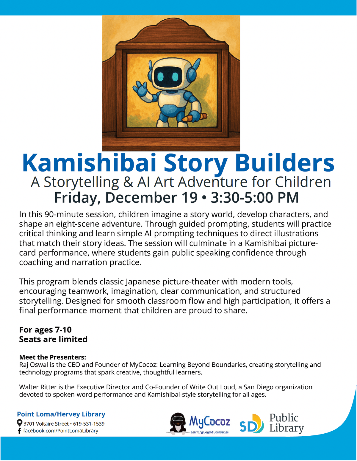 Some of our children workshops include Kamishibai storytelling. Its a unique combination of traditional Japanese picture-card storytelling with modern AI-assisted ideas to build teamwork, creativity, and public speaking confidence.